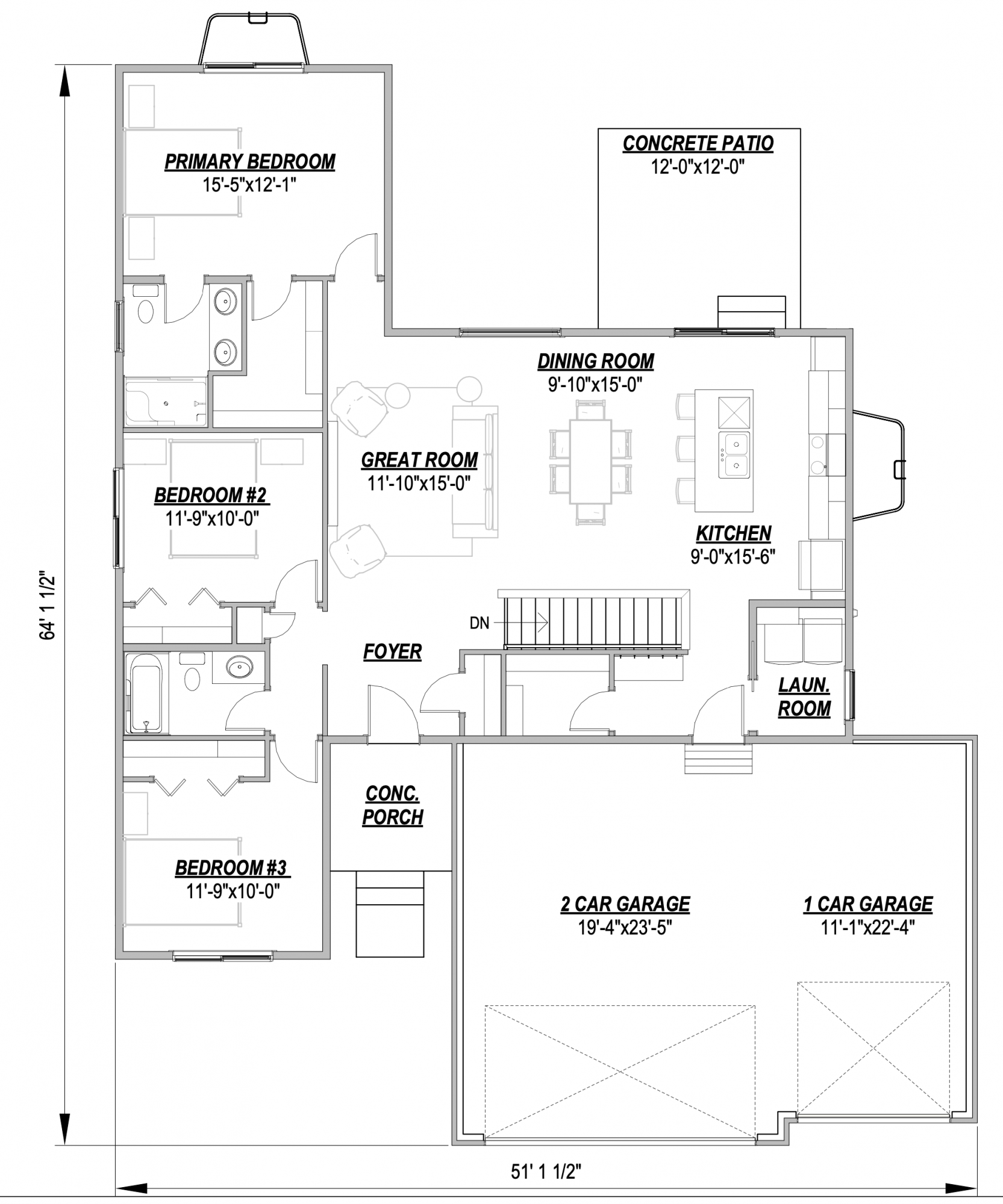1,498 Total Sq Ft / 1,498 Main Floor Sq Ft 977 Possible Basement Sq Ft / 732 Garage Sq Ft / 3 Bed / 2 Bath